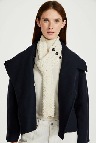 The Aran Buttoned Loop Scarf showcases a beautiful example of the traditional Aran basket stitch. This stitch represents the fisherman’s basket and is a renowned symbol of a good and plentiful catch.