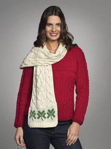 This beautiful scarf is trimmed with green shamrocks on either end with the aran stitch details in the center of the scarf. The soft, sensuous feel of brushed merino wool is the perfect accessory and will keep you feeling warm and cozy.